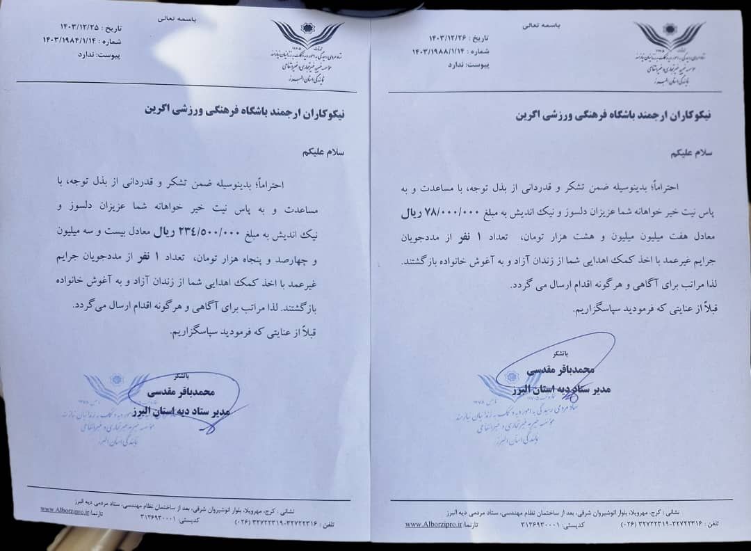 به لطف و مدد الهی و پیگیری مدیریت مجموعه استاد یحیی صالحی زاده برنامه گل ریزان برای آزادی زندانیان مالی غیر عمد در ماه مبارک رمضان سال 1403 برگزار گردید و در این برنامه ورزشکاران اساتید و خانواده های محترم دو مجموعه آگرین و فانوس و هم چنین بازنشستگان محترم نیروی انتظامی مساعدت لازم را داشته و مبلغ 33میلیون تومان جمع آوری و جهت آزادی زندانیان به ستاد دیه استان البرز واریز شد .اجرکم عندالله